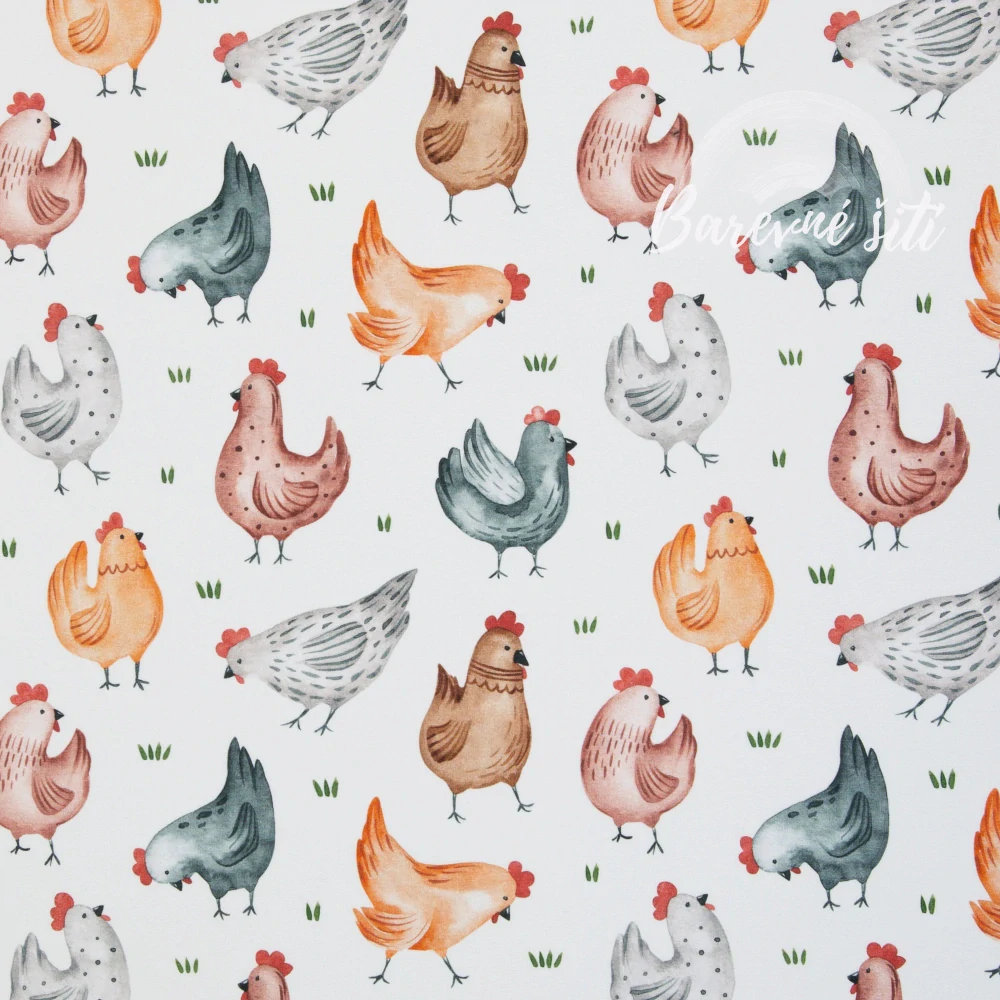 Bavlněný úplet Slepice na světlé. Objevte svěží jarní kolekci německých bavlněných úpletů – lehkých, měkkých a krásně potištěných. Kvalitní úplet s příjemnou pružností se skvěle nosí, drží tvar a snadno se kombinuje.