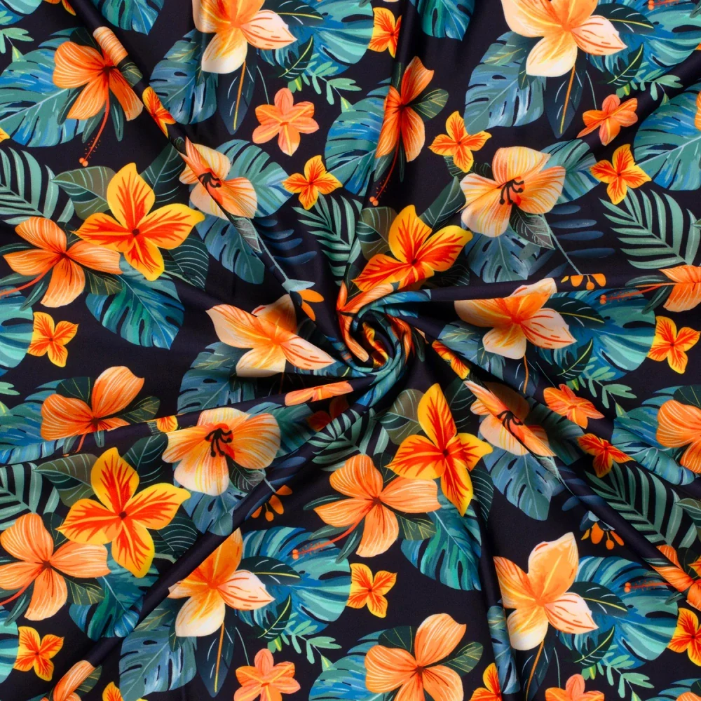Plavkovina UV Oranžové tropické květy. Novinka v našem sortimentu. Plavkovina především s dětskými motivy s ochraných fakotrem UV 50. Můžete ušít nejen plavečky, ale i trička, šatičky, kraťásky, legínky.Látka je lesklá, hebká na omak, velmi pružná. Přesto, že je z polyesteru je velmi příjemná na tělo.