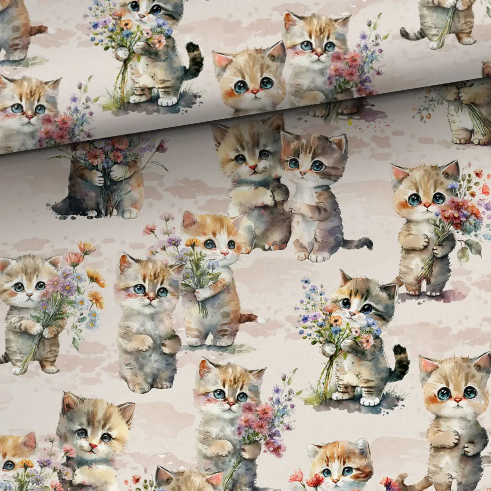 Teplákovina Kočičky s kytičkami (E)🌈 Skladem 4.8 m365,00 Kč/ m301,65 Kč bez DPH