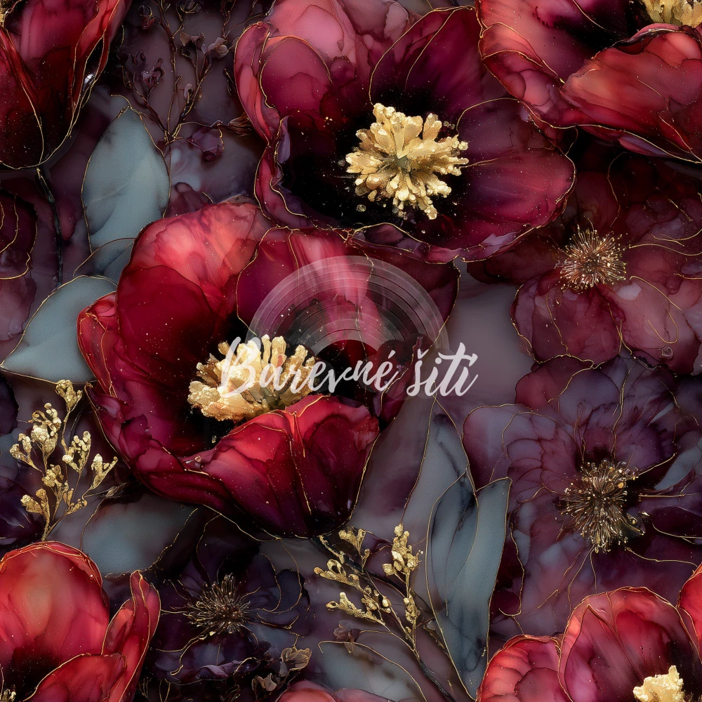 Teplákovina, Luxusní vínové květy se zlatem (E)Není skladem365,00 Kč/ m301,65 Kč bez DPH