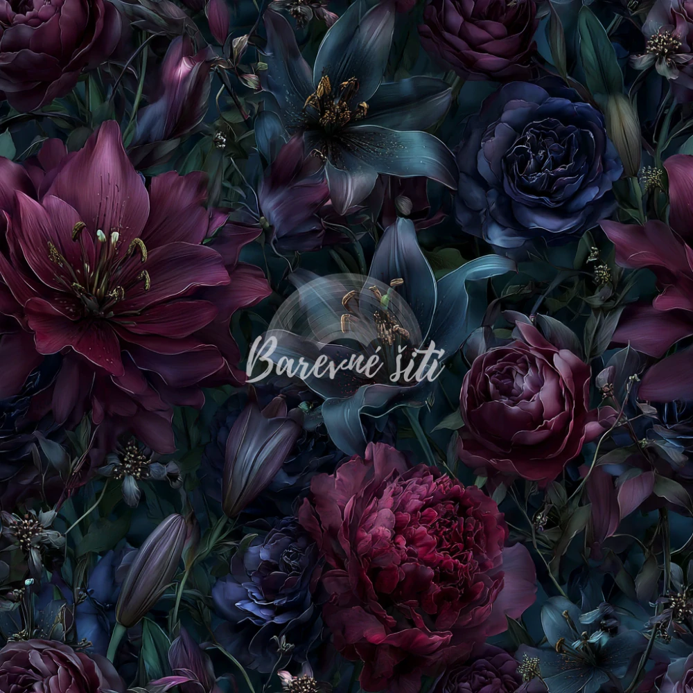 Teplákovina, Tmavé modrozelené a vínové květy (E) 1,25m/ks🌈 Skladem 1 ks410,00 Kč/ ks338,84 Kč bez DPH