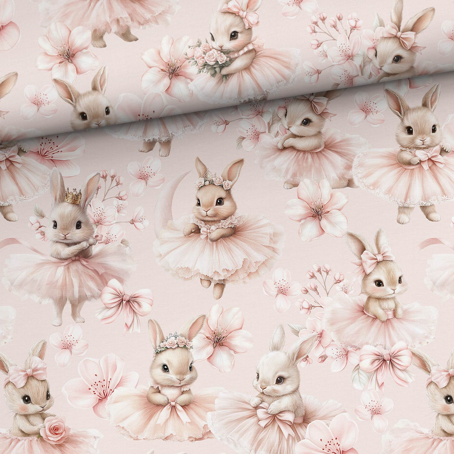Teplákovina, Zaječice v sukýnce, růžové květy, doplňková (E)🌈 Skladem 3.4 m365,00 Kč/ m301,65 Kč bez DPH