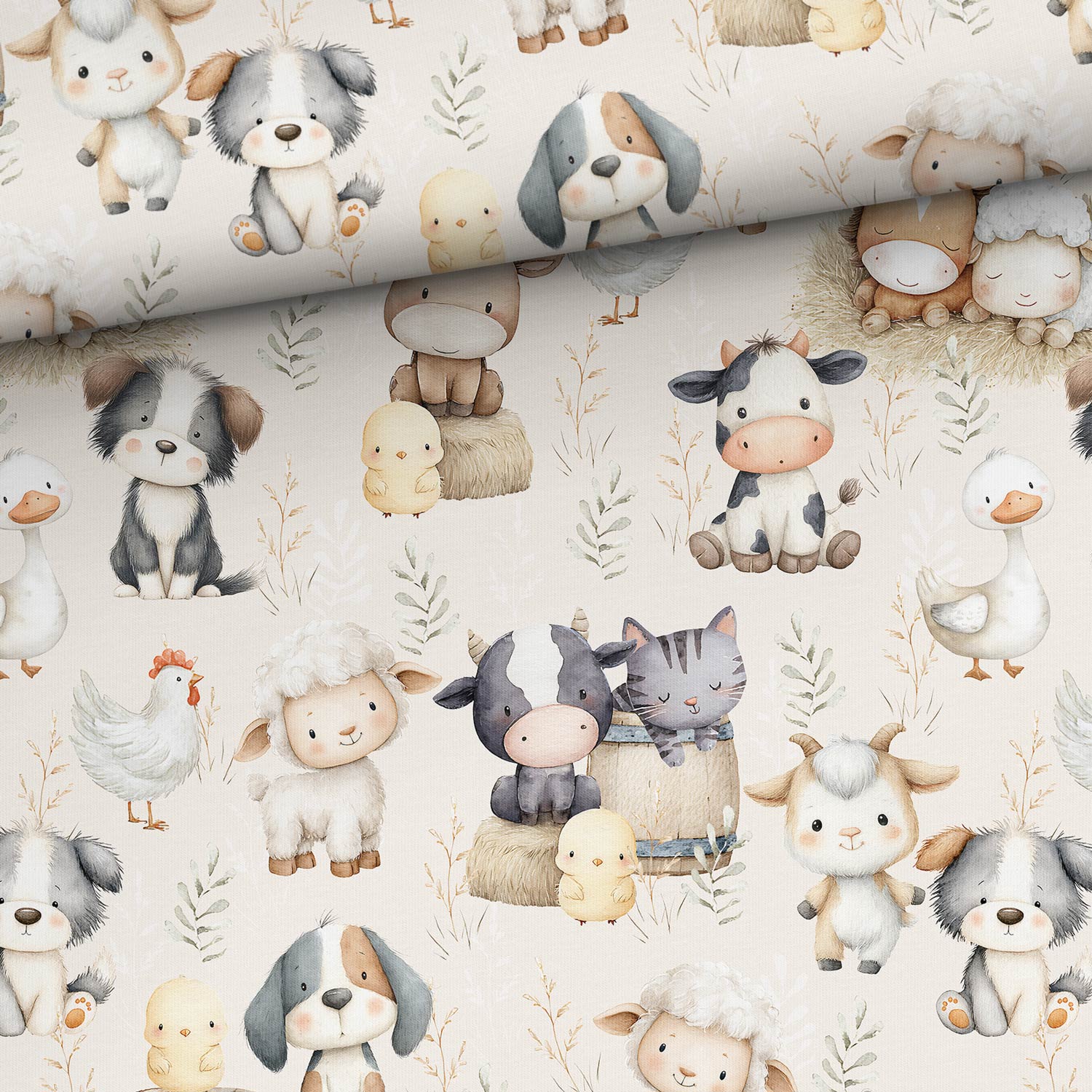 Teplákovina, Zvířátka ze statku doplňková krémová (E)🌈 Skladem 1.9 m365,00 Kč/ m301,65 Kč bez DPH
