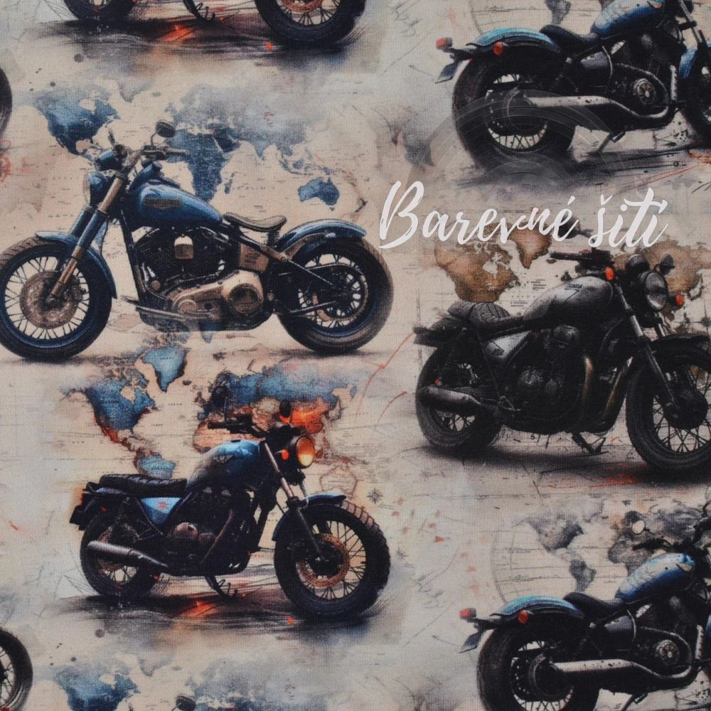 Úplet, Motorky krémová mapa. Kvalita za hezkou cenu - to jsou digitisky z Turecka. Tento trendy vzor rozhodně oživí Váš šatník. Úplet je lehká jemná látka, tenčí než teplákovina. Látka je pružná, prodyšná, hladká na omak, příjemná na tělo. Nosí se velmi pohodlně díky pružnosti v obou směrech. Úplet můžete kombinovat s našemi jednobarevnými úplety či náplety. Samozřejmostí jsou i nitě či jiná galanterie.
