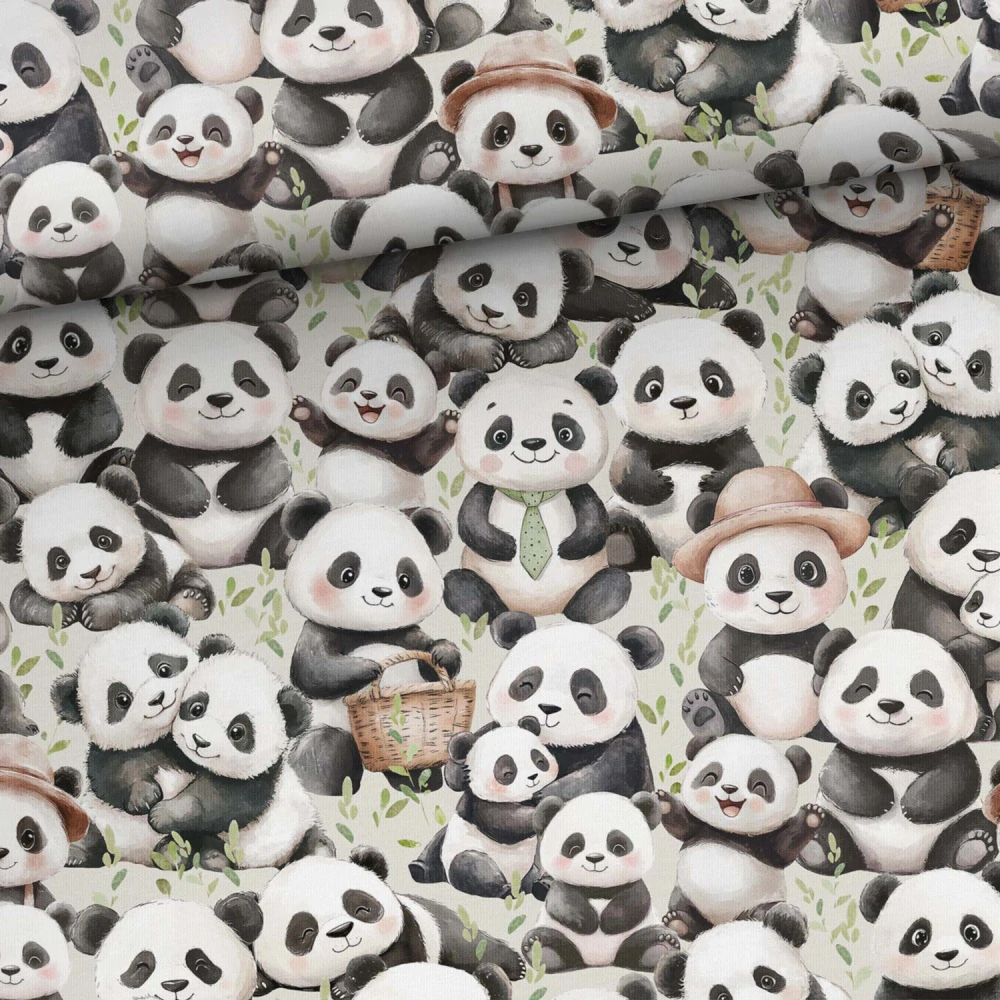 Úplet Panda Love. Kvalitní úplet s digitiskem. Úplet je lehká jemná látka, tenčí než teplákovina. Látka je pružná, prodyšná, hladaká na omak, příjemná na tělo. Nosí se velmi pohodlně díky pružnosti v obou směrech. Vzor můžete dokombinovat s našemi jednobarevkami - náplety či bavlněnými úplety. Samozřejmostí jsou i nitě v ladící se barvě.