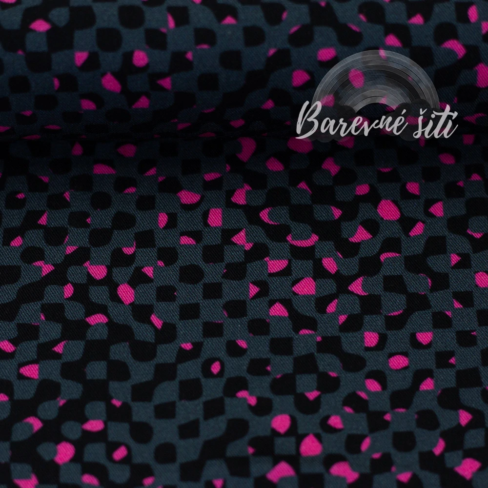 Viskoza Zářivé růžové kostičky na šedé. Viskózová lehká trendy šatovka ideální na vzdušné šaty, halenty, kalhoty.